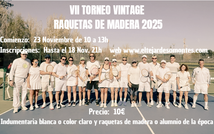 Nos complace presentar, como otros años, el regreso de uno de nuestros históricos torneos: el VII TORNEO VINTAGE - Tejar de Somontes “RAQUETAS DE MADERA" que se celebrará el próximo domingo 23 de noviembre, de 10:00h a 13:00h.