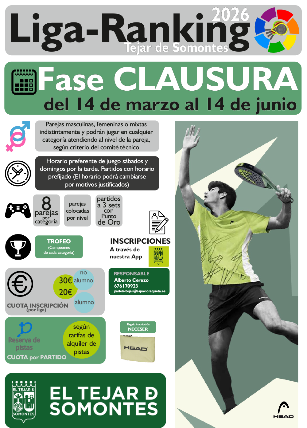 Ya está abierta la inscripción para la Fase Clausura de la Liga Ránking de Pádel 2026, que se disputará del 14 de marzo al 14 de junio. El sistema de puntuación es de ránking absoluto todos contra todos por categorías, cada una de las cuáles constará de 8 parejas. Las parejas podrán ser indistintamente masculinas, femeninas o mixtas y la organización asignará la categoría a cada pareja en función del jugador que tenga más nivel de los dos.